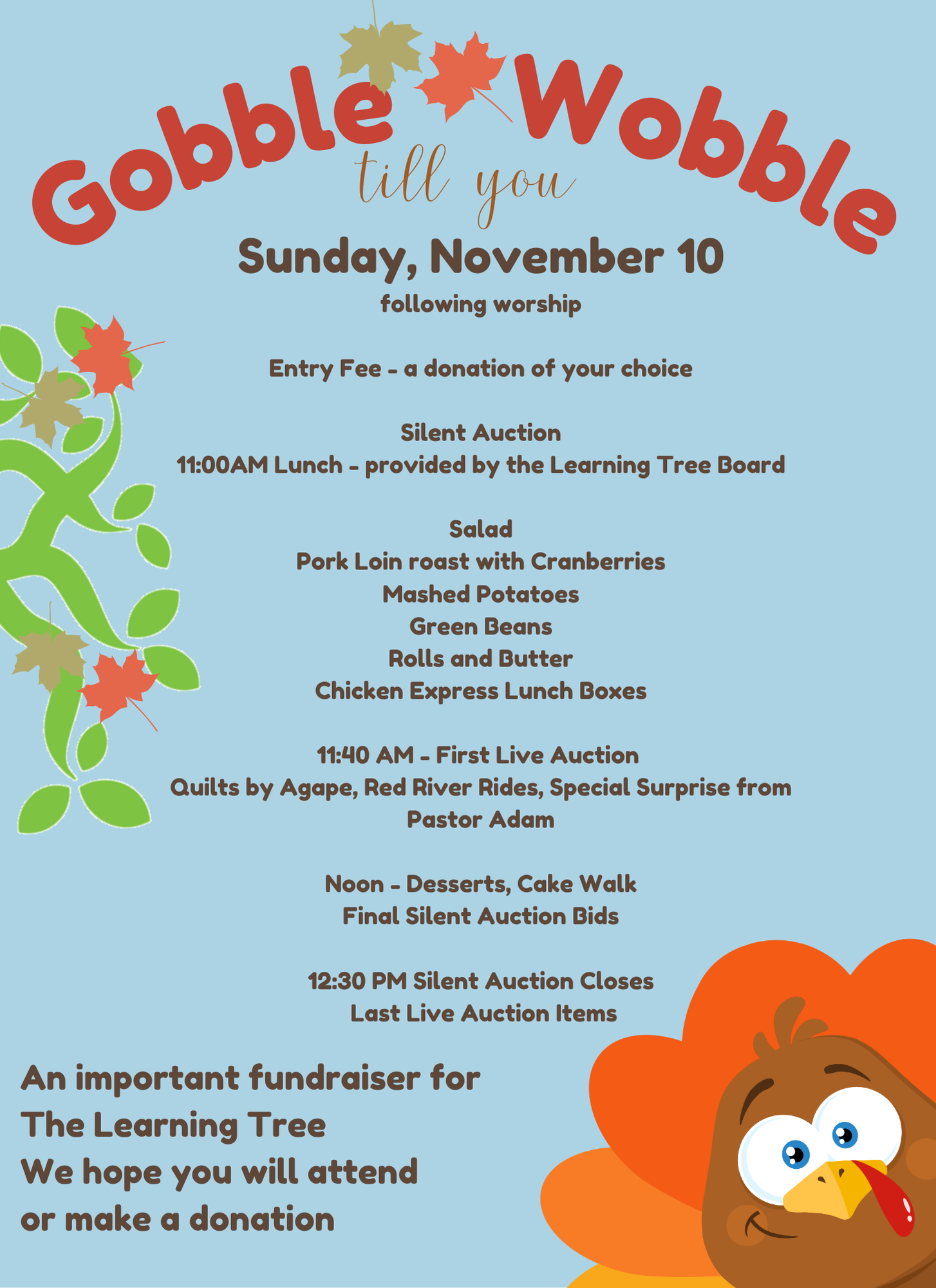 Join us following worship on Sunday, November 10th for our annual fundraiser. A wonderful lunch provided by The Learning Tree Board with Chicken Express Snack Packs for kids too. Live and Silent Auctions. Games for the kids.