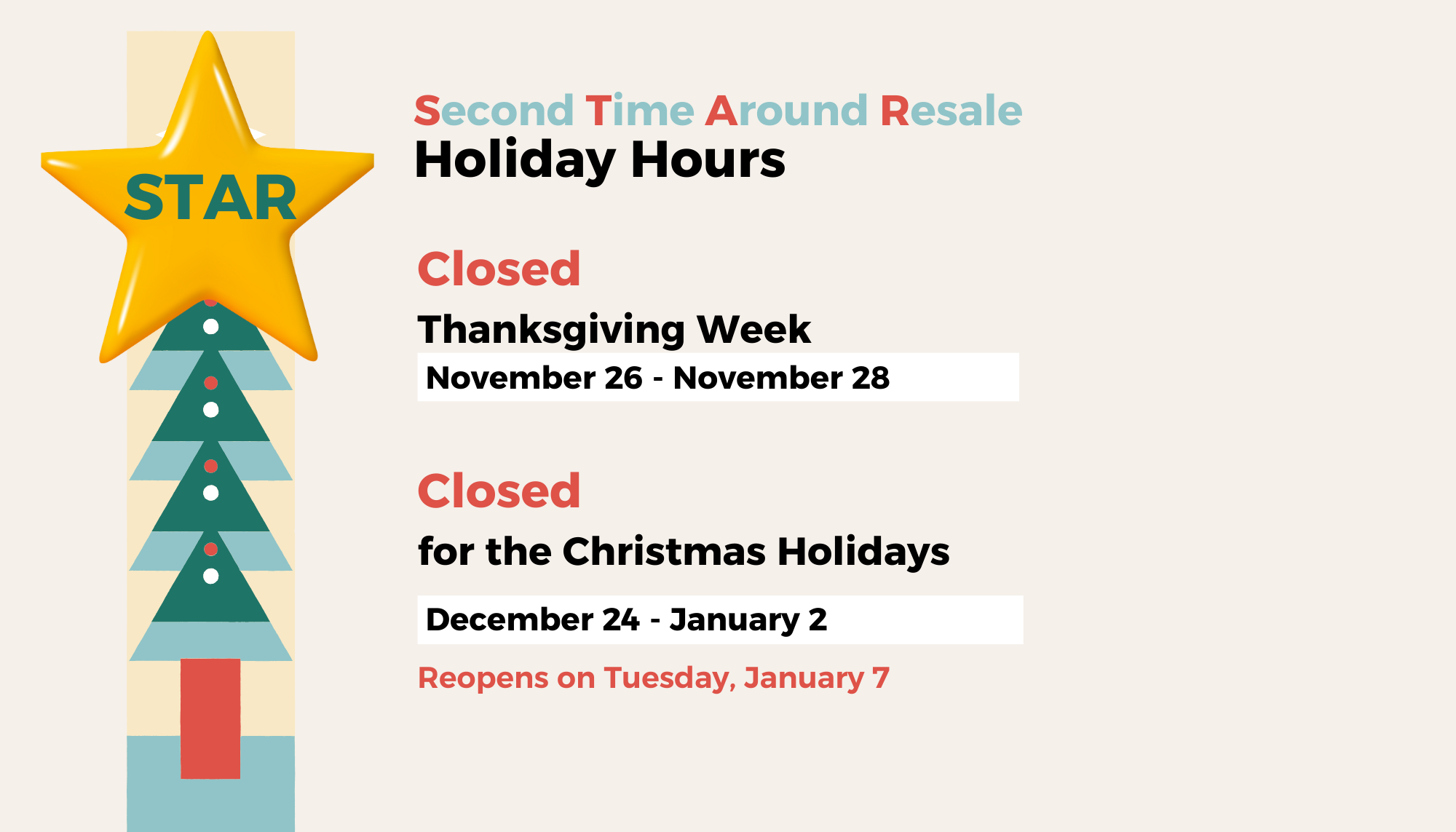 STAR will be closed the week of Thanksgiving - Tuesday, November 26 - Thursday, November 28th, reopening on Tuesday, December 3rd.